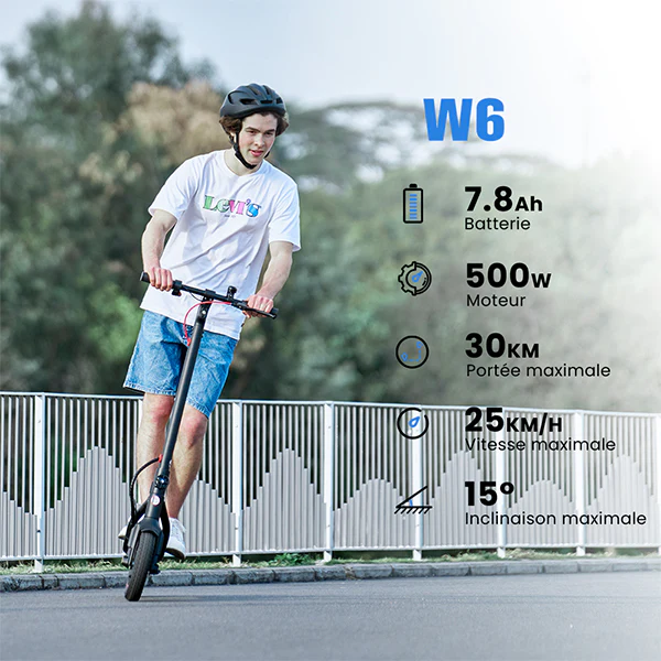 Der W6 500W Elektroroller eignet sich ideal für kurze und mittlere Strecken in der Stadt. Dank des kraftvollen Motors ermöglicht er zügiges Beschleunigen und eine angenehme Fahrt auch bei leichtem Gefälle.